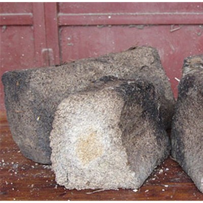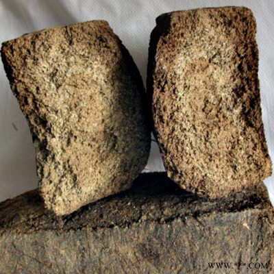 二、将原料压块。将翻拌好的生曲料运到踩曲机上,进行压块,成形,硬度以能形成松而不散的曲坯为度。